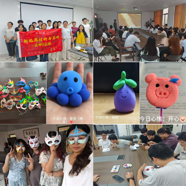 活动以班级为单位,充分发挥了心理委员和“二级蒲公英使者”的朋辈引导作用,系统推进了心理育人工作。在团队协作类活动中,新能源2301班的“珠行万里”游戏让同学们通过U型槽传递小球,从初期的频繁掉落到后期默契配合,展现了团队协作的力量;新材器2401班的“翻瓶子拔河”和“气球吹杯子”游戏,既考验个人技巧,更注重团队策略,现场欢呼声此起彼伏;氢能2401班的“你画我猜”则让同学们在轻松愉快的氛围中增进了解。在艺术表达类活动中,新能源2401班的“情绪面具”环节,同学们用色彩和图案描绘内心感受,创作出表情丰富、色彩斑斓的独特面具;新材器2403班的塑泥创作活动中,太阳花、小房子、小怪兽等作品生动表达了参与者的不同心境;新材器2402班结合专业特色,组织“化学组合趣味游戏”,通过配平化学方程式的卡牌竞技,在游戏中激发学习兴趣,培养积极的学习心态。在集体建设与朋辈支持方面,新能源2402班的“朋友带来的光和热”主题活动通过手写明信片传递温情,让许多同学感受到被关注的温暖;新材器2402班通过“大班旗,小印记”活动,共同设计了特色班旗,增强了集体归属感和荣誉感,并在合影中留下了温暖的班级记忆。